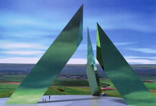 Of a truly topographical scale, the Solar Pyramid will rise out of the landscape as three inclined blades of mirror polished gold and green steel, to form the illusion of pyramidal shape. The point of largest blade, or gnomon, will be 75 metres (246 ft) above a raised oval horizontal plane, 100 metres (328 ft) in length. A ‘planetary piazza’ exploring the complex relationship of motions of the planet Earth and our star the Sun, and accurately recording the passage of time past, present and future.